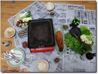 저녁 식사를 위해 이번엔 쏭이 바닥에 신문지를 까는데...