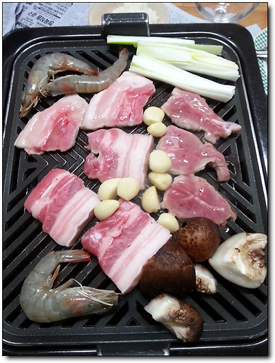 불판에 재료들이 올라가고...
