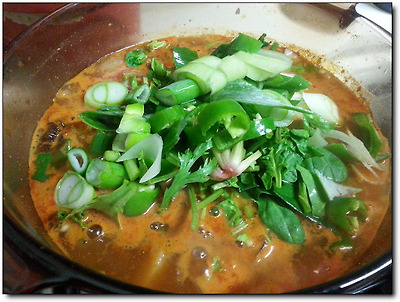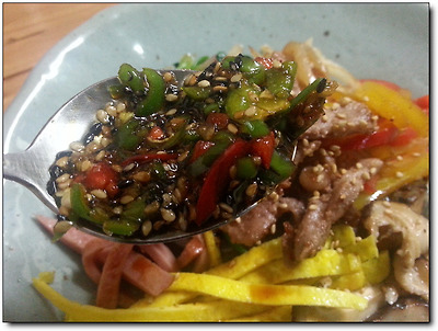 그래서 나도 당면 위에 재료들을 수북히 얹고