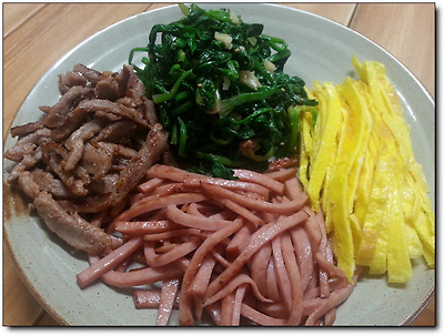 고기도 볶고, 햄도 볶고, 시금치도 양념하고, 지단도 자르고...