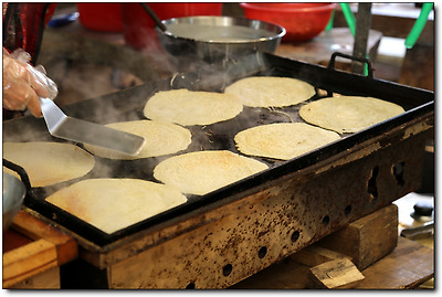철판에 굽는 것은 메밀로 만든 피가 맞다.