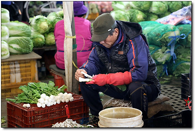 채소 가게 아저씨는 팔 채소들을 곱게 다듬고 계신다.