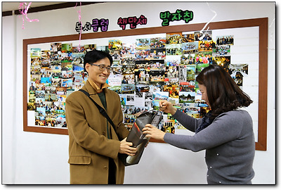 사진 출력에 도움을 주신만큼 허니버터칩님은 사진 게시판 앞에서~