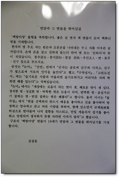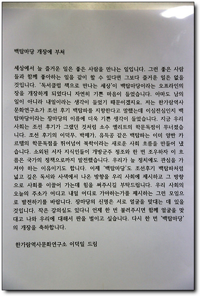 김삼웅 작가님이 백탑마당이 문을 연 것에 축사를 보내오셨답니다.