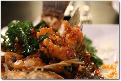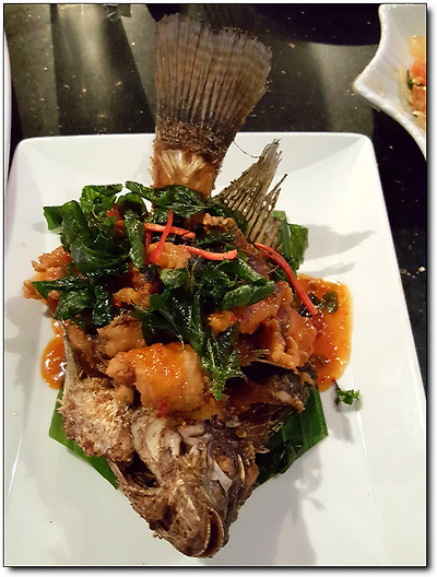 야채와 소스를 살짝 끼얹은 생선 튀김.