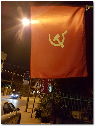 라오스 공산당 국기는 곳곳에 걸려 있다.