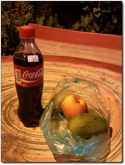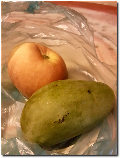 뒷골목 허름한 과일가게에서 산 사과 하나와 정체 모를 신 과일이 전부.