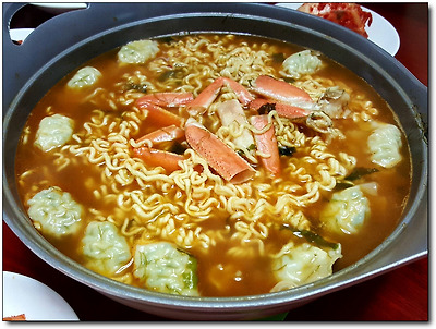 만두까지 먹음직스럽게 동동 떠 있는 대게라면,