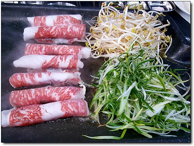 차돌박이가 익으면서 내뿜는 기름에 숙주와 파채도 지글지글 소리를 낸다.