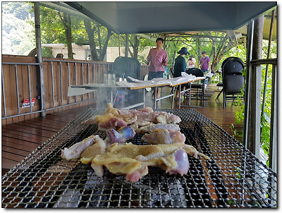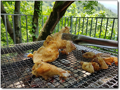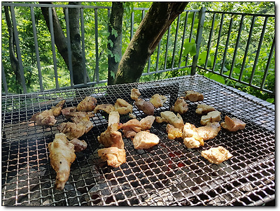 산닭을 숯불 위에 구워 먹는 것은 흔히 경험할 수 없는 것이라