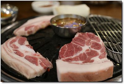 불판에 올려놓고 보니 목살의 두께가 장난 아니다.