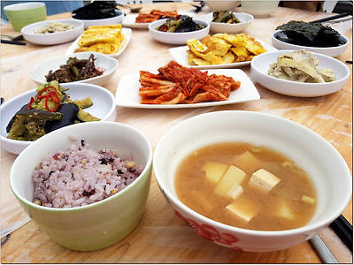옥수수밥과 된장국에 각종 나물을 비롯한 기본 반찬들!
