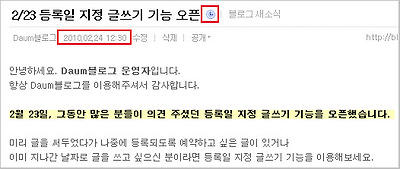 예약된 글에는 목록이나 글보기 페이지에서 예약글 표시가 보여집니다.