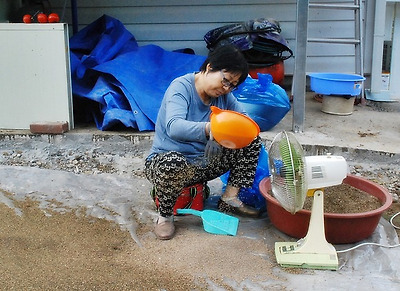 선풍기로 불어 고르고