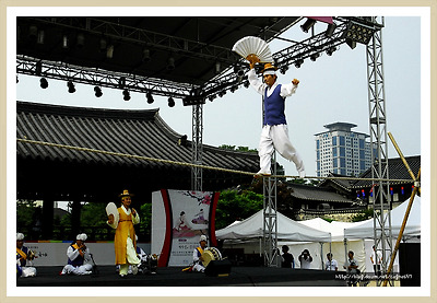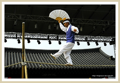 남사당 줄꾼 권원태 명인이 전통 줄타기를 선보이고 있다.