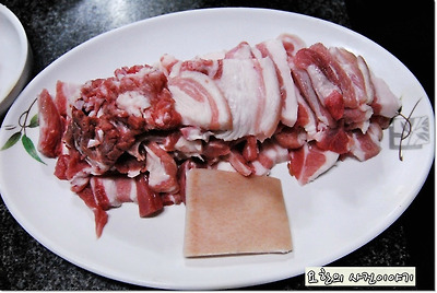 솥뚜겅에 하루정도 냉장숙성시킨 오겹살을 솥뚜겅에돼지 껍데기로 기름을 두루고