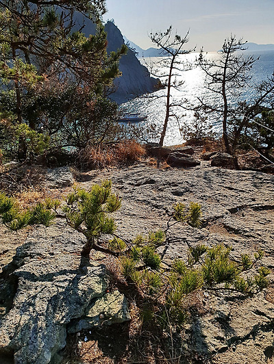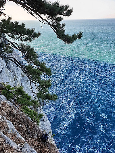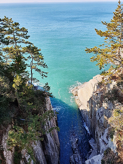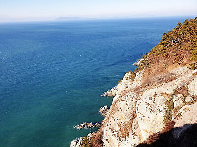 아지른듯한 절벽위로 기암괴석과 바다를 보