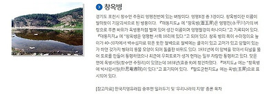본 매물이 있는 곳이 얼마나 청정지역으로 유명한지는 위에 올려진 "창옥병"이라는 기암괴석으로 된 병풍이 있는 곳이 이곳 포천시 창수면 주원리입니다