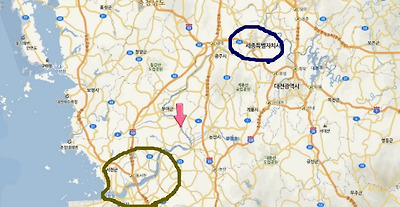 가운데 화살표가 본 매물이고 이편 파란원이 새종시 아래편 노란선이 새만금입니다.