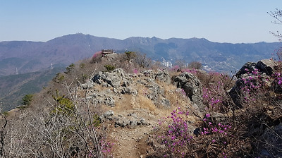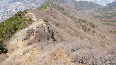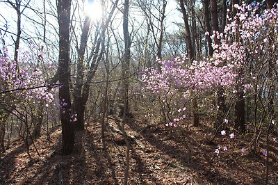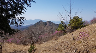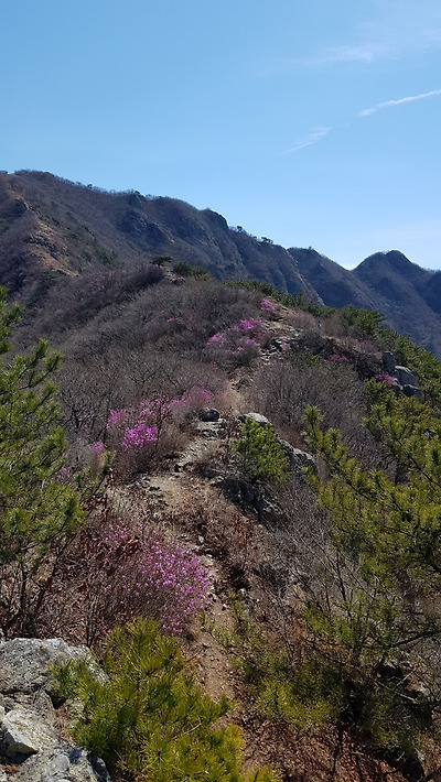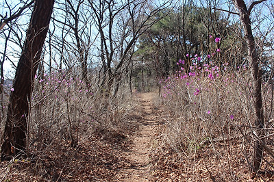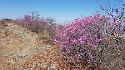 곳곳에 멧돼지 흔적들과 진달래 피어 있는 비탈을 오른다