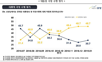 손혜원 의원 부동산투기 의혹 사건, 신재민 전 사무관의 폭로사건 때문인지, 문재인 대통령의 국정수행에 대해서는 비판적 의견이 긍정적 의견을 압도하는 것으로 나타났다.