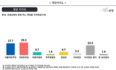 정당에서는 자유한국당에 대한 지지도가 오차 범위 내이지만 더불어민주당을 앞서는 것으로 나타났다. 정당 지지율은 자유한국당은 29.3%, 더불어민주당은 27.7%, 바른미래당과 정의당은 각각 6.7%, 민주평화당은 1.8%였다. ‘기타정당’ ‘지지정당이 없음’ ‘잘 모름’이라 응답한 비율은 각각 3.4%, 22.5%, 1.9%였다.