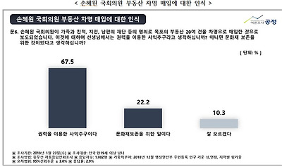 이 조사에 의하면 또 손혜원 더불어민주당 의원(탈당 후 무소속)이 목포 지역에 가족과 친척, 지인, 남편의 재단 명의로 행한 부동산을 매입은 ‘권력을 이용한 사익 추구’(67.5%)라는 의견이 ‘문화재 보존을 위한 일’(22.2%)이라는 의견보다 3배가량 높은 것으로 나타났다.
