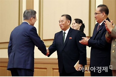 △문재인 대통령이 평창올림픽 폐막식에 참석한 천안함 폭침의 주범 김영철을 맞아 웃으면서 악수하고 있다.뒤편에 김정은의 여동생 김여정의 모습도 보인다(사진=아시아 경제)