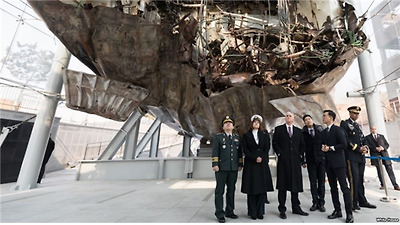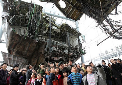 △경기도 평택의 해군 2함대사령부를 방문한 어린이들이 북한 어뢰에 의해 폭침됐다가 인양된 천안함을 살펴보고있다(사진=조선닷컴 캡쳐)