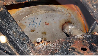 △천안함 폭침현장에서 수거된 북한제 CHT-02D 어뢰의 프로펠러와 추진체 등 일부부품. 어뢰에 북한제 임을 가리키는 ‘1번’이란 숫자가 선명이 나타나있다(사진=연합뉴스 캡쳐)