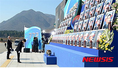 △천안함 전사자 46명과 구조 작업중 순직한 고 한주호 중위의 영정(한가운데)