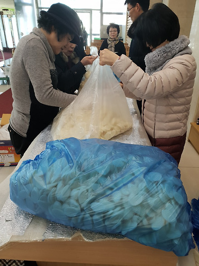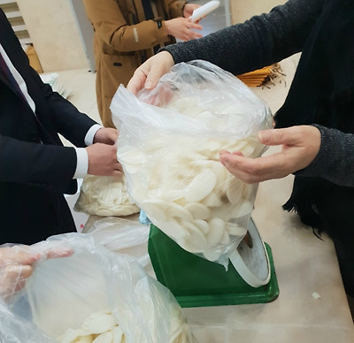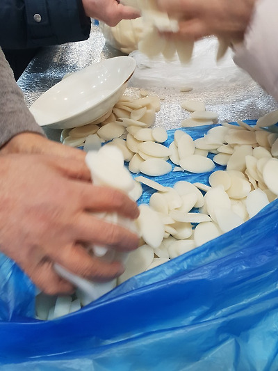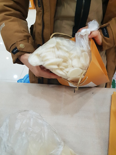 열심히 떡국떡을 봉지에 넣는 모습 아름답습니다