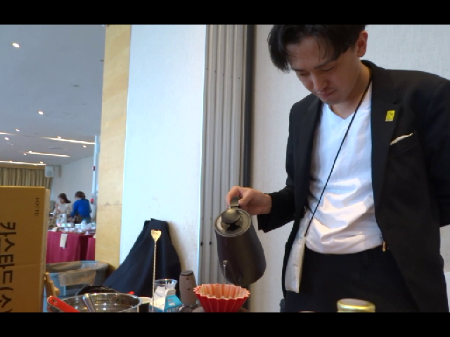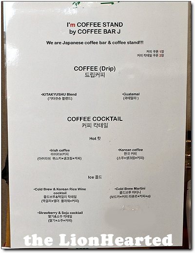 일본에서 참여한 업체인데 정확한 상호와 지역 설명이 부족하여 애로가 있다, 특이하게 우리나라 소주와 막걸리, 캄파리소다 등을 올려 준비하고 있었다, 드립커피는 스티커 한 장으로, 커피 칵테일은 두 장으로 주문이 가능했다,