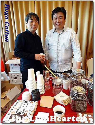 위 사진에서 왼쪽이 김호영 CEO, 오른쪽이 온천장에서 카페느루를 운영하던 박상우 대표로서 최근에 휴고에 합류하였다고 한다, 당일 수많은 커피를 내렸을 것으로 생각된다, 사진 하단 부위에 보면 구매스티커가 붙어 있는 게 보인다, 왼쪽에 서 있는 분은 부산맛집기행 [해초☆]특별회원으로서 휴고에서 직접 잘 볶여진 원두를 구입하여 자택에서 드립하여 마시는 분이다,