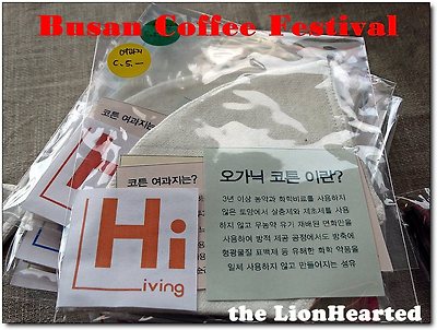 벡스코 등의 행사와 달리 무료입장이어서 주최측의 배려가 마음에 든다, 아래 사진 중 중앙의 작은 스티커는 행사장에서 커피를 구입하여 마실 수 있는 용도로서 10,000 원에 현장에서 구입할 수 있다, 메뉴에 따라서 스티커 한 장 또는 두 장을 해당부스에 마련된 곳에 주문시 붙이면 된다, 루왁커피가 있었는데 나중에 와서 마셔 보겠다고 했다가 잊어 버리고 못 마신게 아쉽다,