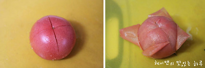 토마토에 십자로 칼집을 넣고 끓는 물에 살짝 데치면