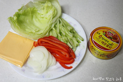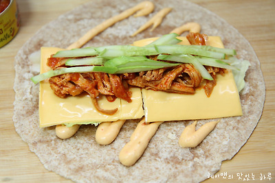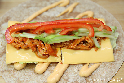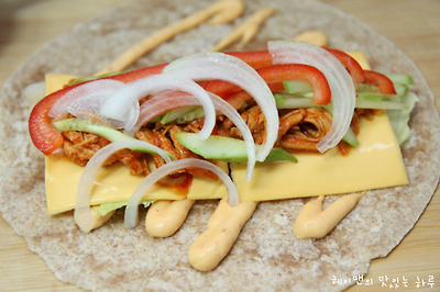 매운불닭 통조림 1개, 양상추, 슬라이스 치즈2장, 오이, 파프리카, 양파, 또띠아1장, 갈릭앤칠리소스