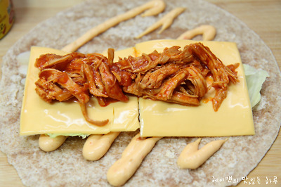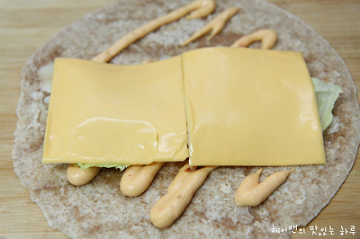 2. 또띠아위에 갈릭앤 칠리소스를 바르고 양상추, 치즈를 올려주세요~