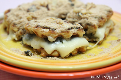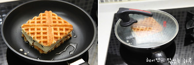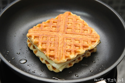 1. 후라이팬에 기름을 살짝 두르고 와플위에 모짜렐라치즈 인절미를 올려주세요~