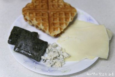 와플 2개, 인절미, 모짜렐라치즈2장, 고르곤졸라치즈, 콩가루, 견과류