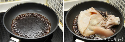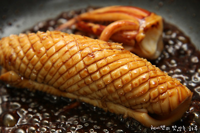 5. 오징어를 조려주면 저절로 모양이 말린답니다. 이대로 양념장을 끼얹어가면서 조려주세요~