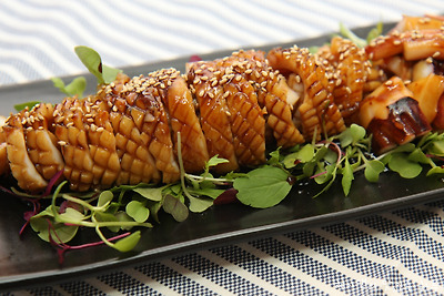 6. 완성된 오징어는 먹기 좋은 크기로 썰어서 접시에 담아준 후 남은 양념장을 위에 올려주세요~