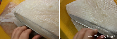 오징어 껍질을 벗길때 끝부분에 칼집을 넣어준 후 손으로 벗겨주면 잘 벗겨진답니다.