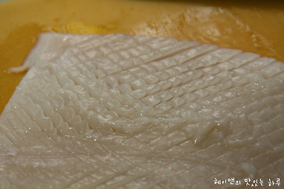 2. 오징어 안쪽에 칼집을 사선으로 넣어주고 반대쪽 사선으로도 넣어주세요~