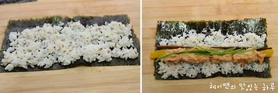 반으로 자른 김위에 밥을 올리고