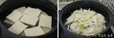 2. 냄비에 두부를 넣고 물2컵과 채썬 양파를 올려주세요~