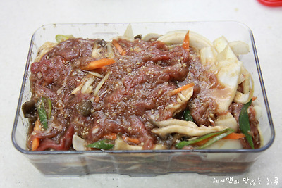 소불고기 1키로, 설탕 3T, 청주 3T, 양파1개, 당근반개, 대파1개, 느타리버섯 한팩