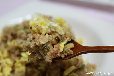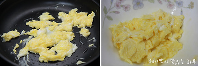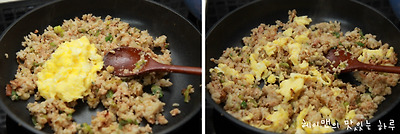 밥이 고슬하게 볶아지면 미리 만들어둔 스크램블을 넣고 볶아주세요~