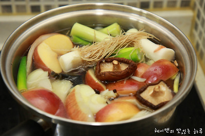 대파, 건표고, 사과, 양파, 다시마, 통후추를 넣고 끓인 후