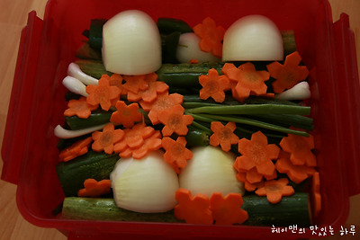 오이와 쪽파를 켜켜히 김치통에 담아주세요~